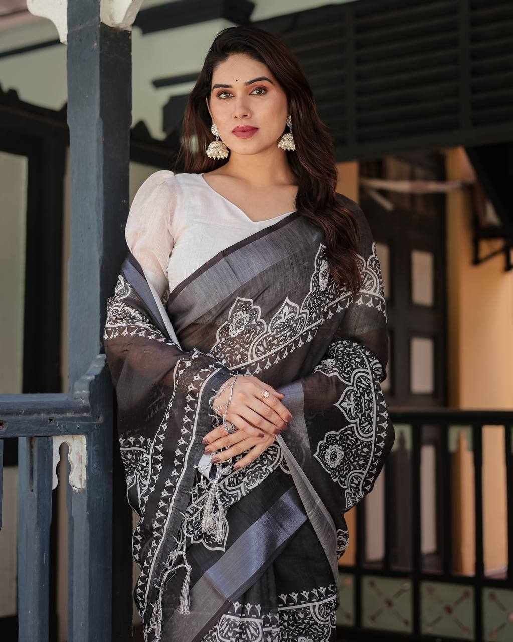 Saree Fabric: Premium Linen Cotton with elegant Silver Weaving Patta and beautiful digital print
