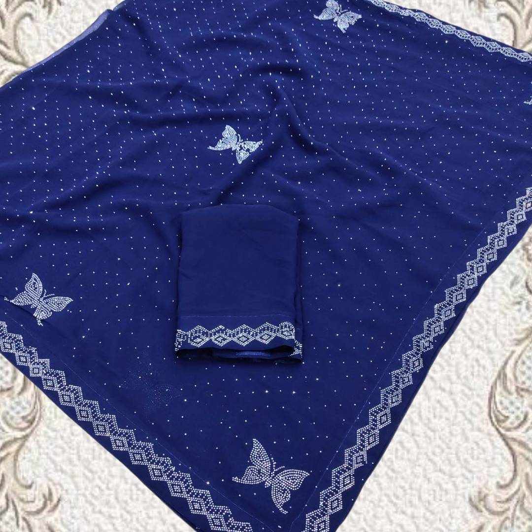 S4s Blue Siroski Butterfly Stones Lace Georgette Party Wear Saree